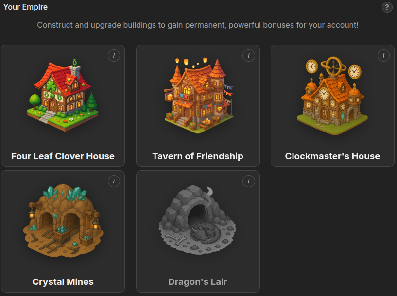 Your empire consist of 5 different buildings, each of which can improve an aspect of the game: