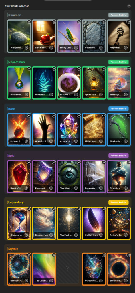 The game’s main thing is about collecting cards. There are several tiers with different degrees of rarity, and different rewards for the card or the collection. (all values are in Satoshi)